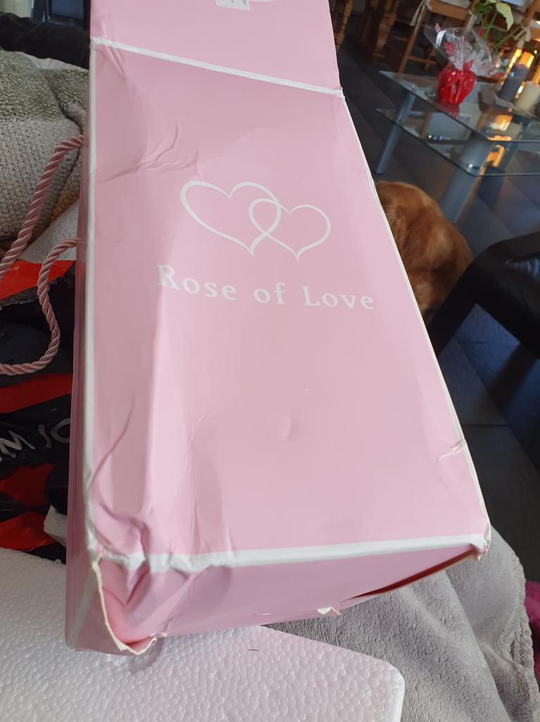 Cred că au jucat fotbal cu pachetul meu 📦 Acesta trebuia să fie un cadou, dar nu cred că îl pot oferi așa. Trebuie să-l scot și să-l pun într-o cutie diferită. Cel puțin interiorul și trandafirul sunt în siguranță. Și trandafirul este frumos.