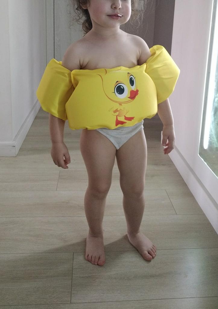 Potrivire perfectă pentru un copil de 4 ani dacă cureaua este strânsă complet. Copilul este mulțumit și nu renunță la produs. Prin urmare, sunt 100% mulțumit. Încă nu l-au testat în rezervoare, deoarece este încă rece pentru înot, dar pare fiabil.