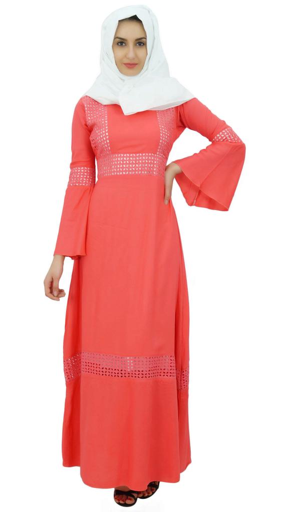 Bimba's latest collection of dresses includes this adorable maxi abaya dress. Made of soft and comfortable pashmina blend fabric, this long sleeve maxi dress with cut work & belt with hijab. The dress is of full length. It really is a great formal or semi formal maxi dress.