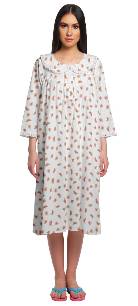 * Sale For: 1 Nightwear Br * Material: 100 Cotton Br * Length: 46 Inches (Approx) Br * Model Height: 176 Cm Br * Pattern: Printed Br * Features: Below Knee Length, 3 4 Sleeve With Lace Edges, Round Neck, Button-Down Placket, Two Side Pockets. Br * Care: Medium Machine Wash Cool, Warm Iron, Iron While Damp. Br * Size Information: Please Refer To Our Size Chart Before Making The Purchase. If Your Size Is In Between Two Sizes, We Recommend That You Choose A Larger Size. Br