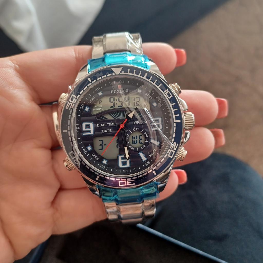 Ceas foxbox LİGE 2022 ⌚⌚⌚ Model LIGE : FB0007 Tip ceas : barbati Stil : Sport , Casual , Moda -100% Cu eticheta si de inalta calitate Caracteristici noi ( estimat ) : [ Diametru carcasa : 46 mm ] 【 Grosimea carcasei : 15 mm ) [ Latimea benzii : 22 mm ] 【 Total Lungime ) : 220 mm ] [ Material curelei : Oțel inoxidabil ] Caracteristică : Curea și carcasă : Carcasa impermeabilă din oțel inoxidabil și cureaua de ceas oferă o experiență confortabilă de purtare . Ceas de mână pentru bărbați rezistent la apă: în general rezistent la stropire sau scufundare scurtă în apă, dar nu este potrivit pentru dușul fierbinte (Notă: vă rugăm să nu acționați butonul în apă). Indicator luminos: Urmărirea luminoasă poate fi afișată în întuneric (trebuie să absorbi suficientă lumină înainte de întuneric, nu-ți face griji, este ușor de făcut). Ceas digital: Afișaj de timp dublu cu funcție de iluminare de fundal cu LED și rezistent la șocuri, dată automată, ceas cu alarmă, cronometru și alte funcții. Pachetul include: manual de utilizare, cârpă de ștergere, ceas original, cutie de ceas de marcă neagră, instrument de reglare a curelei de ceas