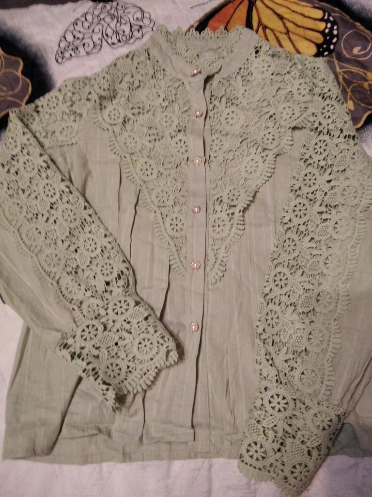 Aceasta bluza este frumoasa! Are culoarea mea preferată - jad chinezesc deschis. Nicio țesătură nu a fost cruțată aici, incredibil... 🤗🍀😍🐍🙏 Piept 122 cm lățime, lungime de la umeri 65 cm. Doar umărul din stânga este puțin mai scurt, aproape 1cm tăiat. ....... Am spalat camasa si s-a schimbat Dantela este mai colorata, dar stofa de bumbac a devenit ceva mai gri. 🤔🧐😲