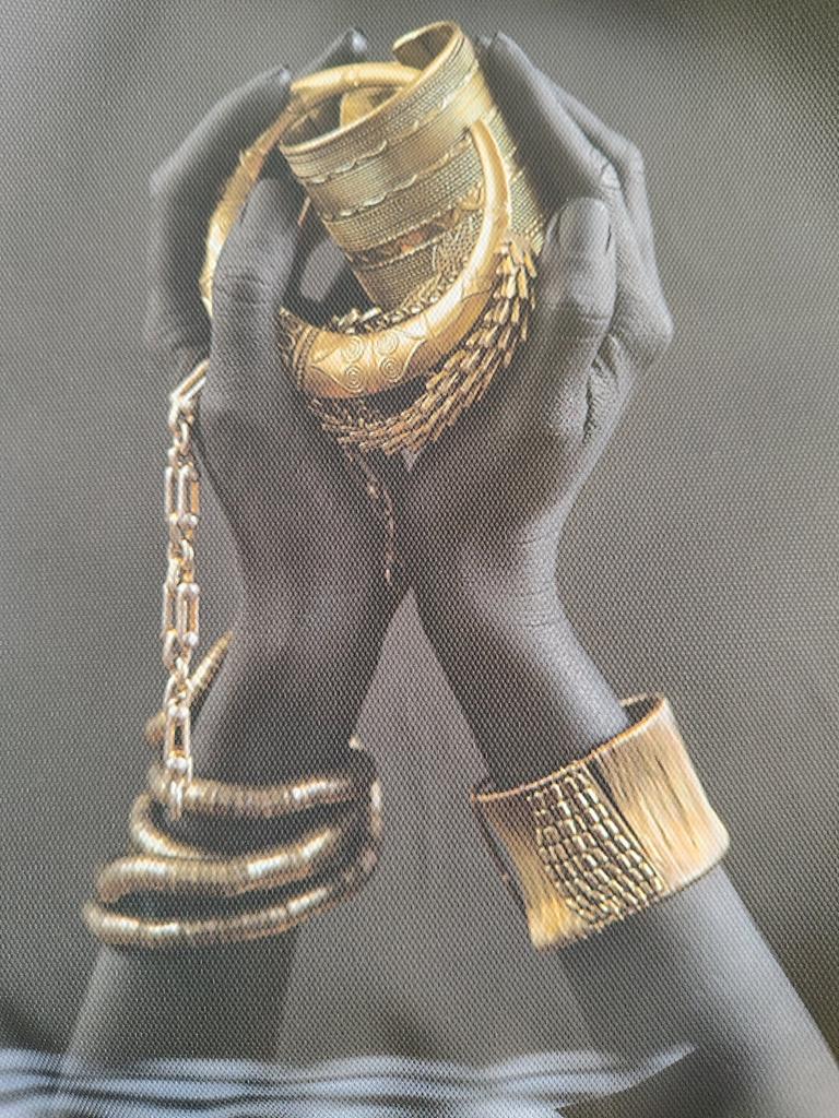 Femeie africană ținând în mână bijuterii de aur postere și imprimeuri din pânză Modele negre Picturi artistice pe perete Poze pentru sufragerie