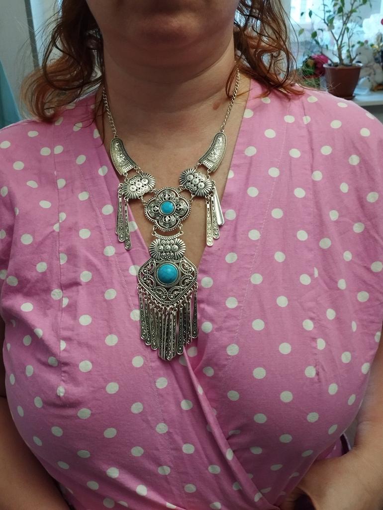 Arată frumos, exact ca în pozele vânzătorului. Deși pare masivă, este o bijuterie foarte ușoară. Nu se potrivește la gâtul larg, țineți cont de asta. O recomand, pentru ședințe foto sau la anumite ținute.