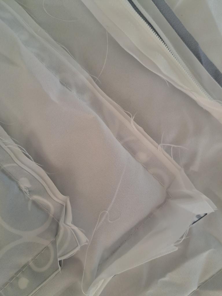 Cusăturile sunt strânse în unele locuri, cusăturile sunt rare (pasul cusăturilor este de aproape 0,5 cm), marginile nu sunt surfilate, iar materialul se destramă. În general, după 2-3 spălări totul se va destrăma