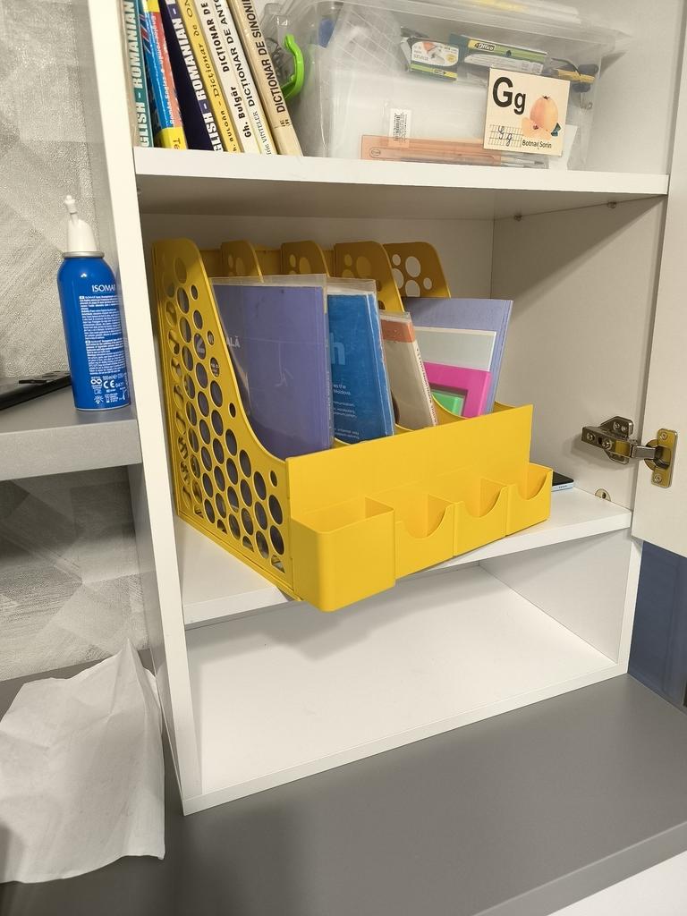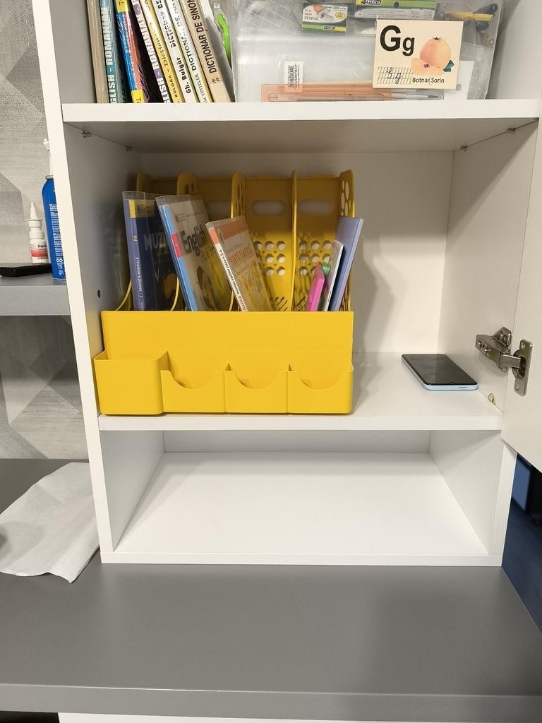 E foarte bun . Chiar sunt mulțumită de comanda . E foarte mare și încap bine cărțile și caiete . Vine în bucățile și trebuie asamblată . Culoarea e deosebită . Chiar recomand dacă aveți o masă mare și aveți probleme cu încăperea cărților și caietelor .