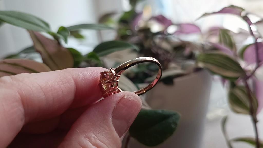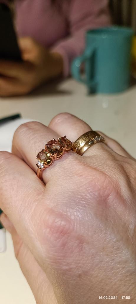 Un inel foarte frumos. Metalul arată ca auriu, pietrele exterioare sunt roz-maroniu, cea centrală este mai roz, croiala este frumoasă, culoarea transparentă prinde imediat razele și se joacă, culorile se schimbă în verde strălucitor și închis în funcție de iluminarea lampă. Vă mulțumim foarte mult pentru ambalajul de marcă și calitatea produsului. Recomand pentru achizitie. Aș dori să-mi doresc lansarea mărimii 10 sau cel puțin 9.5.