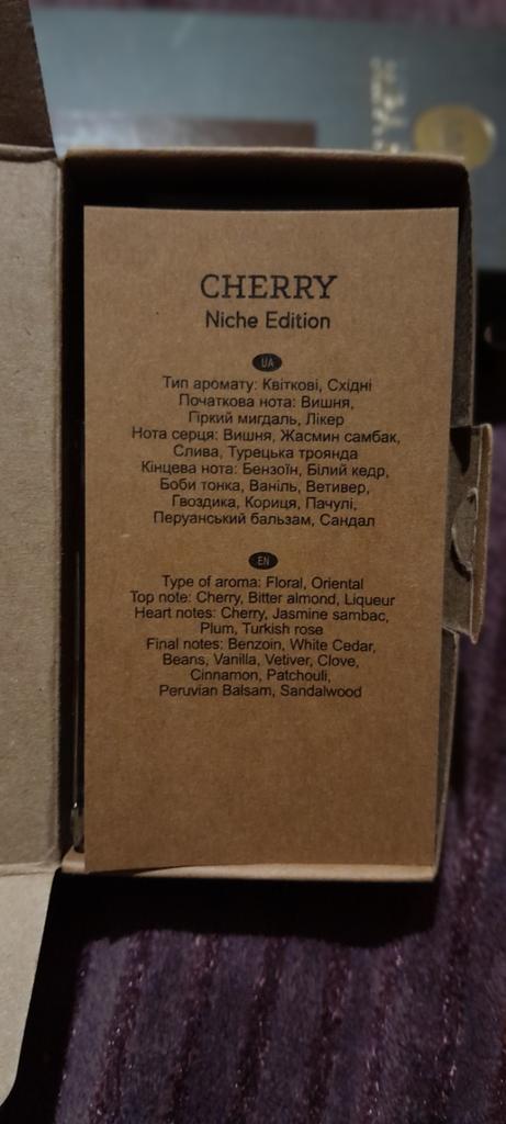 Parfumul este minunat. A venit foarte repede. Nu este foarte persistent, dar în general este ok, nu pot spune că miroase a cireșe, dar aroma este plăcută (există o notă de cireșe, dar mai mult a iasomie sau ceva similar). În orice caz, comandați, poate că pe dumneavoastră această aromă se dezvăluie ca cireșe.