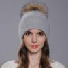Păr de iepure de angora de iarnă pentru femei, tricotat aluat prăjit, răsucire în strat dublu, pălărie din lână, cu bile de blană de raton