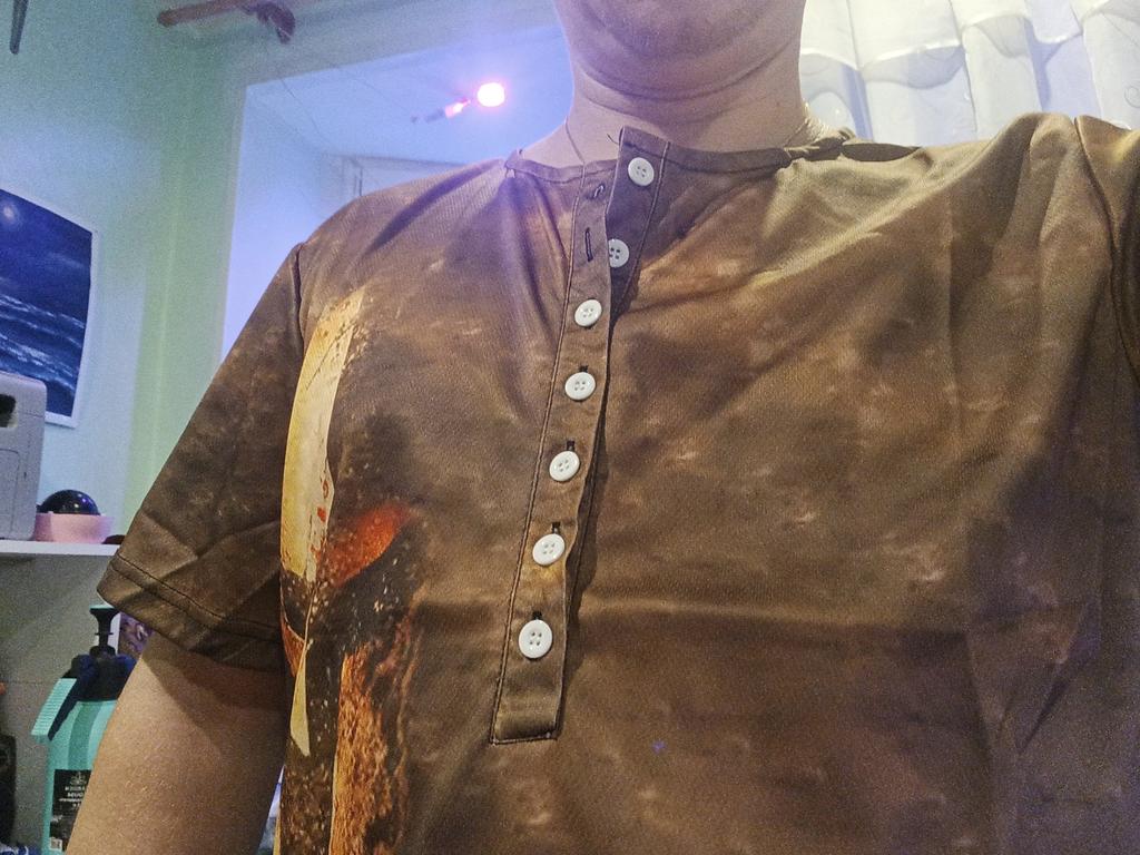 Nu prea se potrivește cu fotografia: interiorul este alb, butoanele sunt și ele albe. Și nu se potrivește deloc cu culoarea imprimeului tricoului. Imprimarea este o porcărie completă, diferența față de fotografie este mare. Impresiile nu au fost foarte bune. In plus, partea de jos a tricoului este lata (pentru burtica), desi se potriveste marimii pe umeri. Nu recomand produsul!