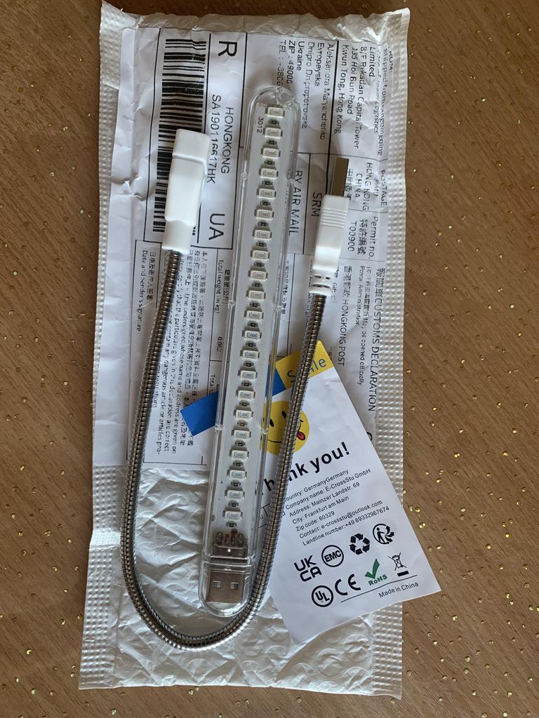 Lampa a venit într-o pungă umflată, fără cutie. Lucru. Dar nu este foarte convenabil să conectați la o priză, aveți nevoie de un prelungitor cu conector USB. Lampa este mica, flexibila. Mulțumesc vânzătorului.