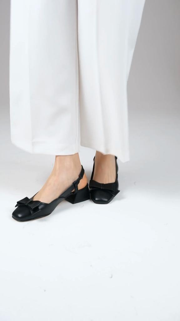 Pantofi cu toc scurt, cu accesorii cu fundă albă și spate deschis..