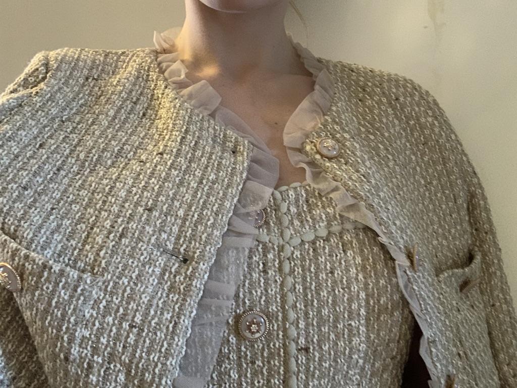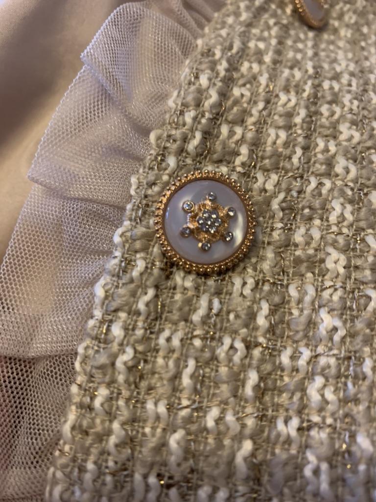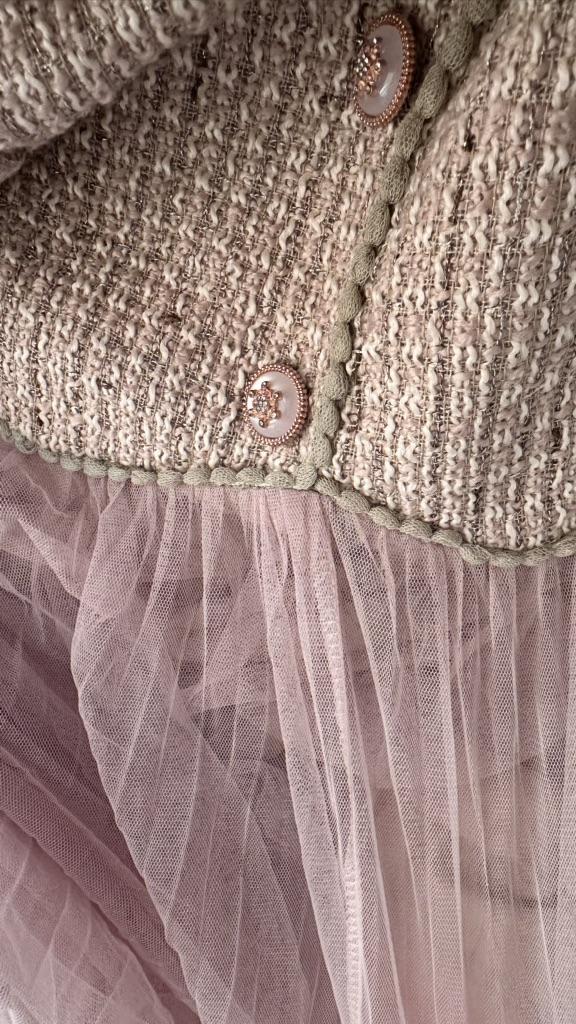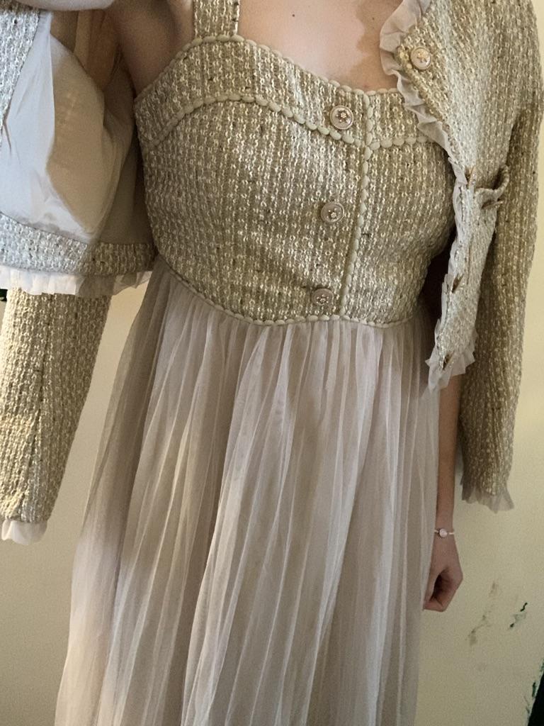 Nouă rochie midi de primăvară toamnă cu bretele spaghete din lână patchwork plasă tulle + jachetă scurtă din tweed haină pentru femei Set 2 piese ținute