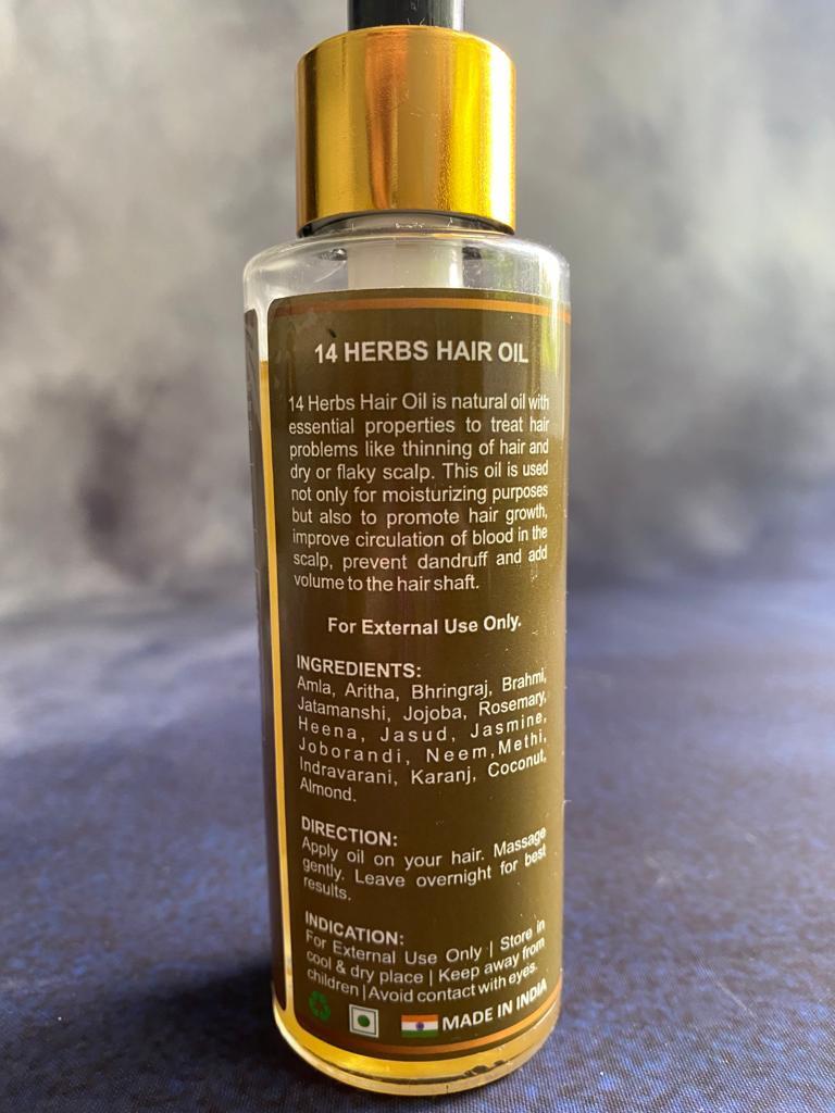 Ierburile găsite în șamponul de păr cu 14 ierburi includ Reetha, Amla, Rozmarin, frunze de hena, iasomie, ulei de jojoba, Karanja, Brahmi, schinduf, Joborandi, Jatamansi, Bhringraj, Neem, Shikakai și Hibiscus.. Fiecare dintre aceste plante are propriile sale proprietăți unice care pot aduce beneficii părului și scalpului.