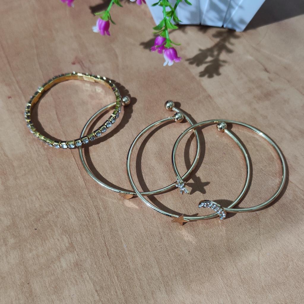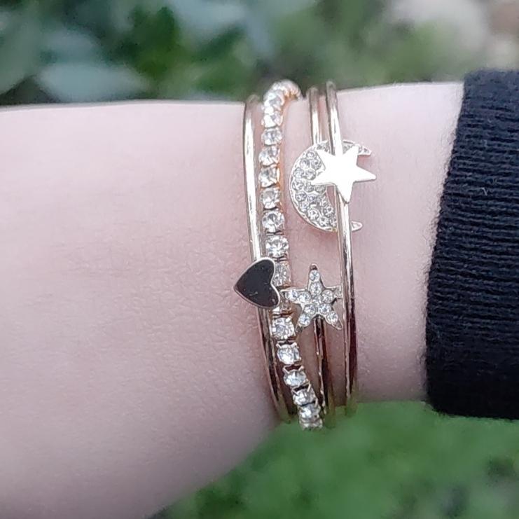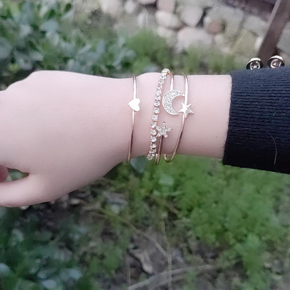 🛍️Un set de brățări pentru femei și fete🛍️ Evaluare: ⭐⭐⭐⭐⭐ 👈 Aceste anvelope sunt foarte frumoase! Vine într-un set de patru brățări, una cu o inimă, una cu o stea, una cu o stea și lună și a patra cu pietre strălucitoare.. Mi-a placut foarte mult designul si am ales culoarea aurie, este foarte frumos la mana (: • Bratarile sunt foarte frumoase de purtat si le puteti folosi si pentru a le aduce cadou • Brățările sunt de înaltă calitate. • Brățările au venit la mine în livrare protejată. 👈 Mulțumesc mult lui RUI RUI YU pentru că mi-a trimis acest colier uimitor! Foarte recomandat să cumpărați 🛍️