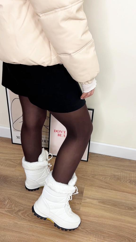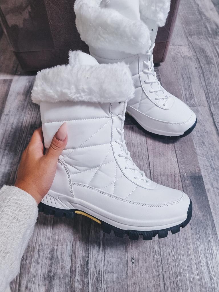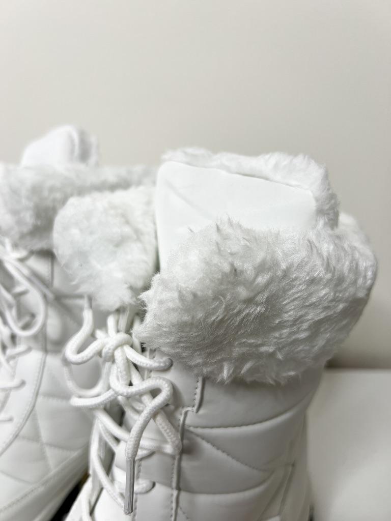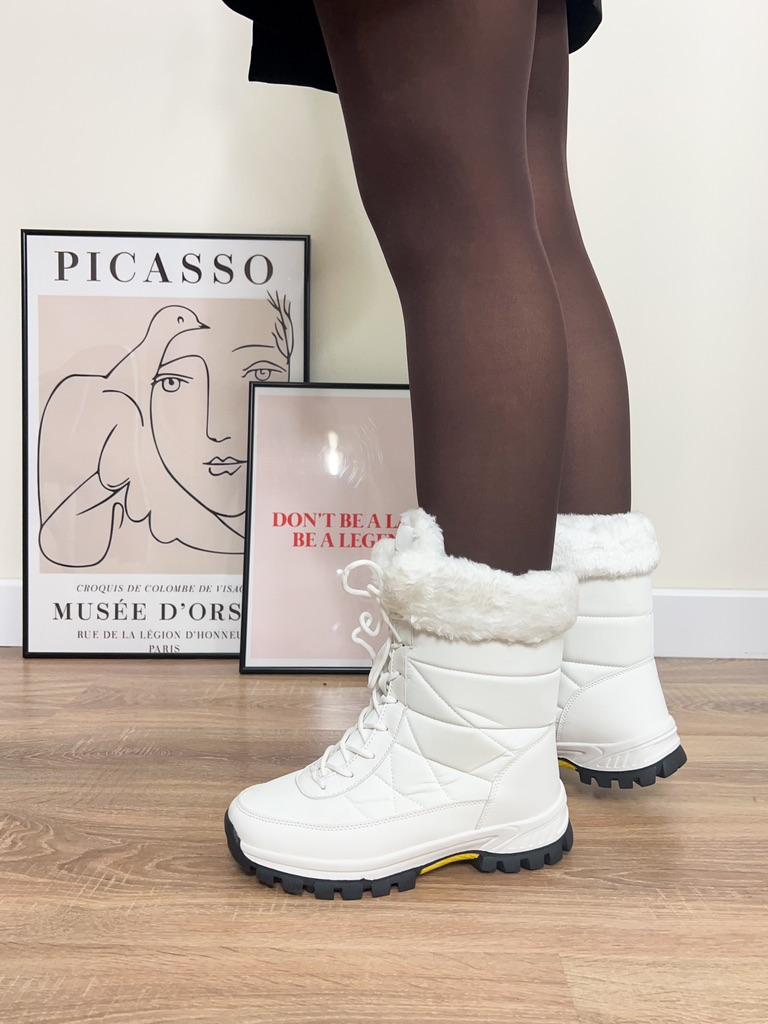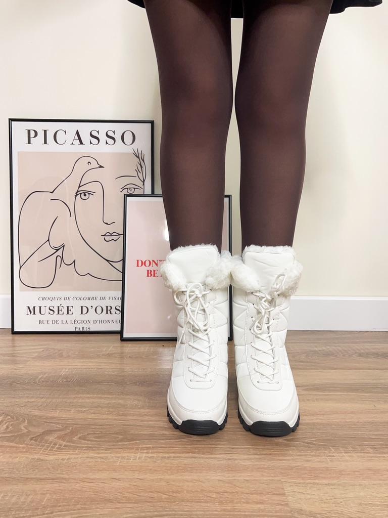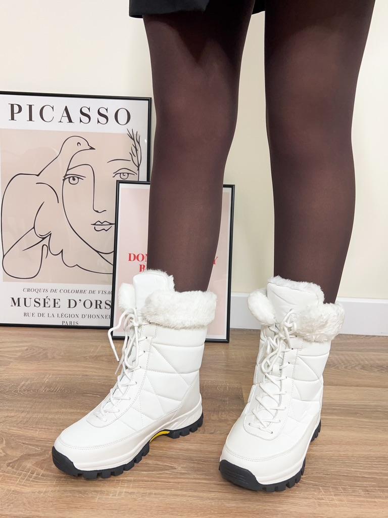 Cizme de iarnă cu blană albă pufoasă Blana este artificiala, moale, groasa si lunga. Sper să vă țină de cald iarna. Cizmele sunt cusute îngrijit, nu există nereguli, urme de lipici sau alte defecte vizibile. Talpa este ondulata, inalta, doar pentru plimbarile de iarna. Calitatea corespunde economiei sau segmentului de piață de masă scăzută. Pentru pret mi se pare o achizitie buna. Vedeți recenzia video și fotografii pentru mai multe detalii.