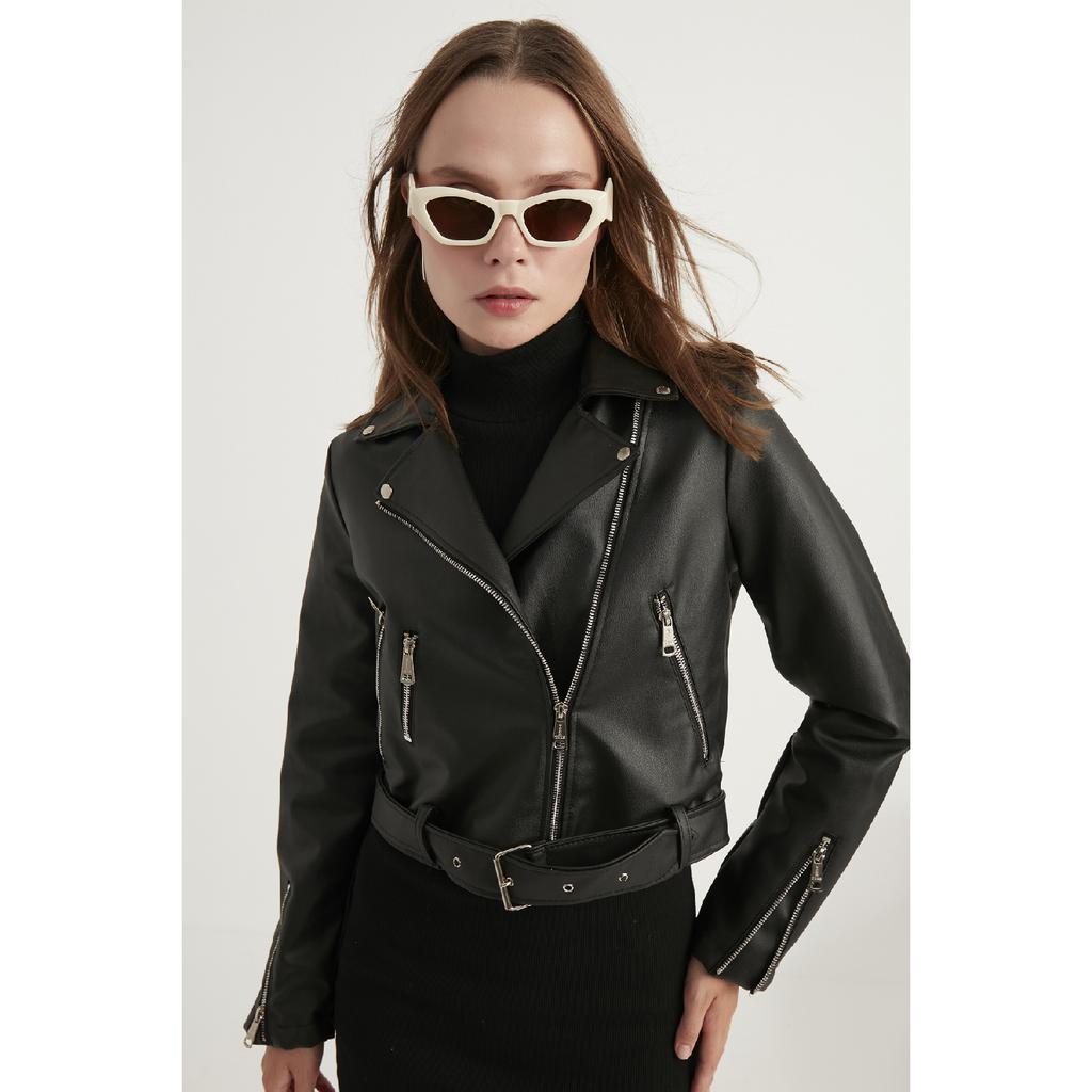 Jachetă de piele neagră cu fermoar pentru femei