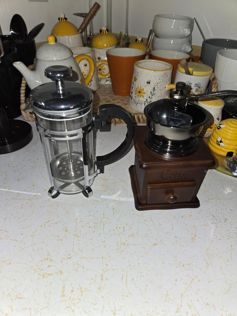 Îmi place presa franceză. Am folosit-o azi. N-am încercat încă râșnița de cafea.