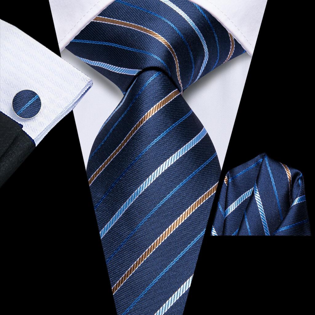 Hi-Tie Set de cravată clasică de cravată de mătase Jacquard cu dungi auriu albastru pentru bărbați