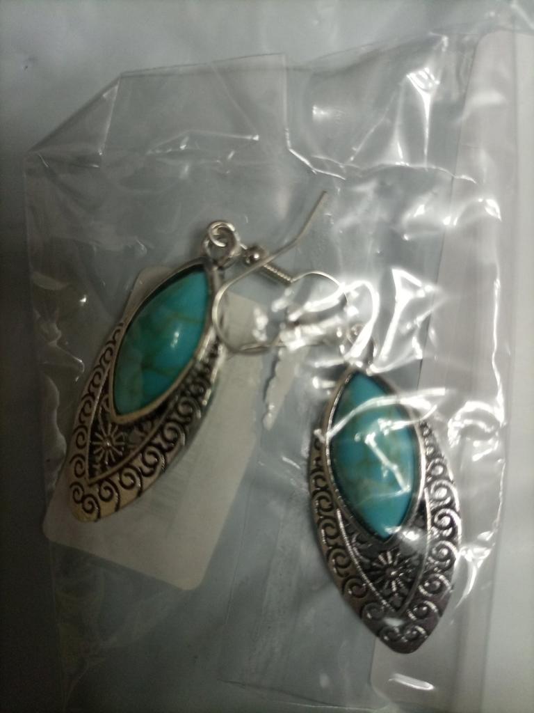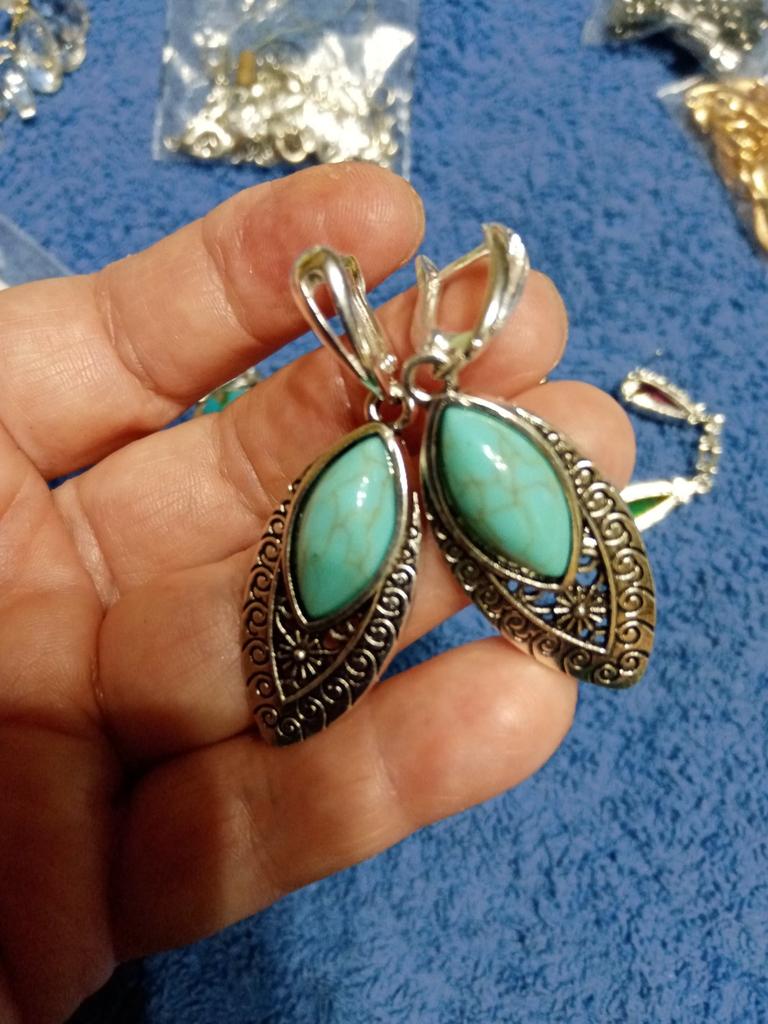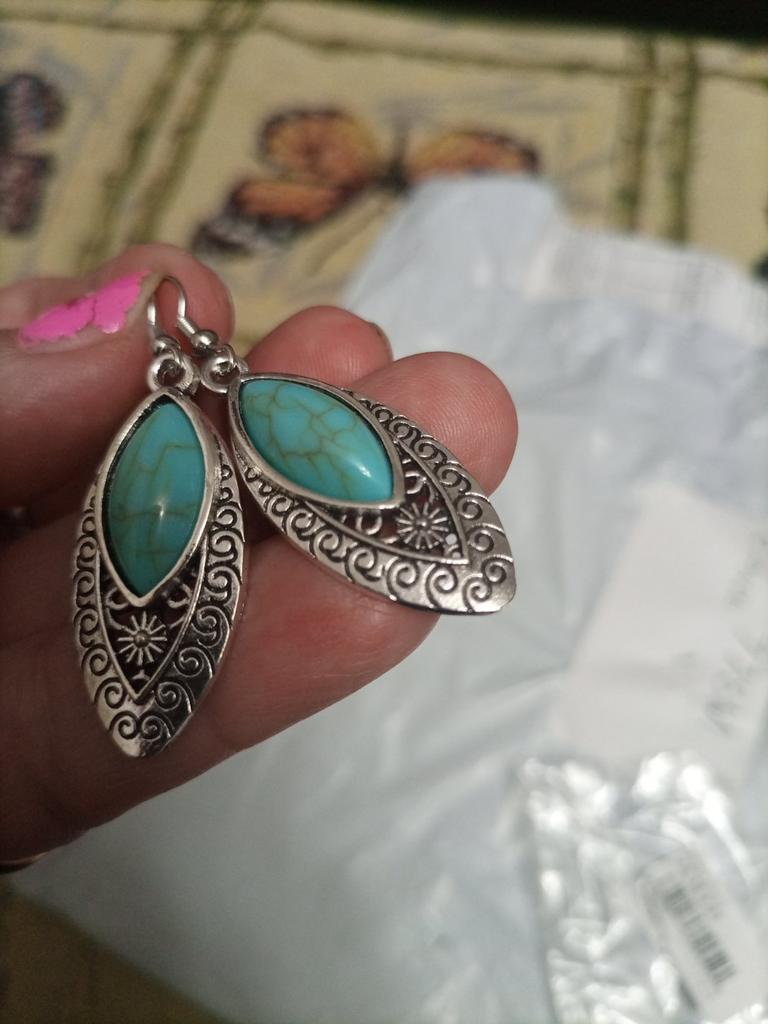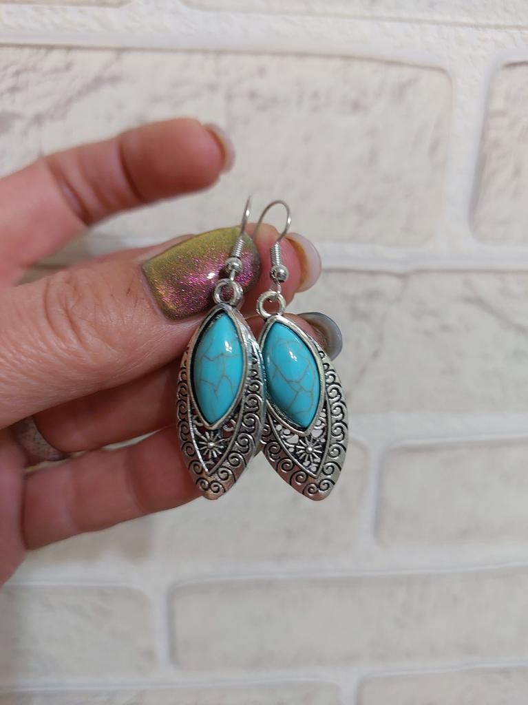 Cercei cu cârlig în formă de picătură, cu incrustație boemă, turcoaz, ajurat, sculptat