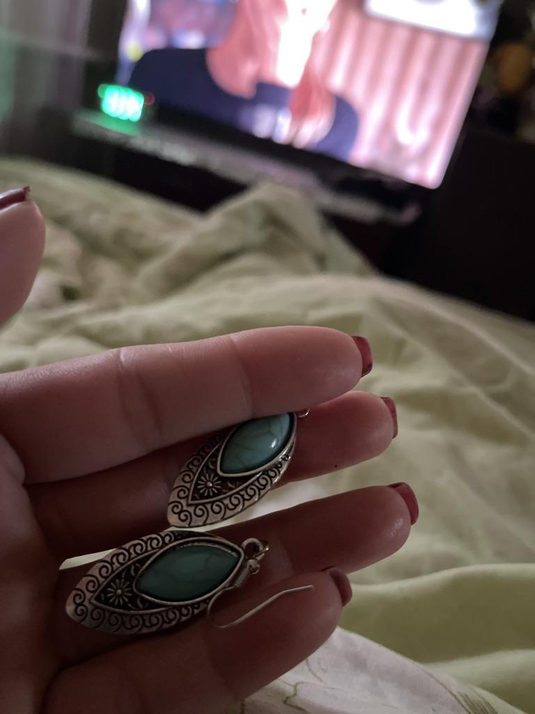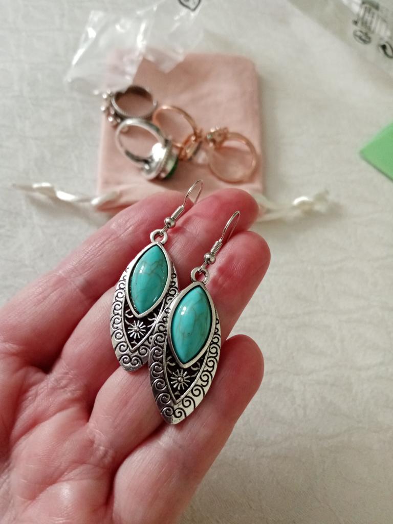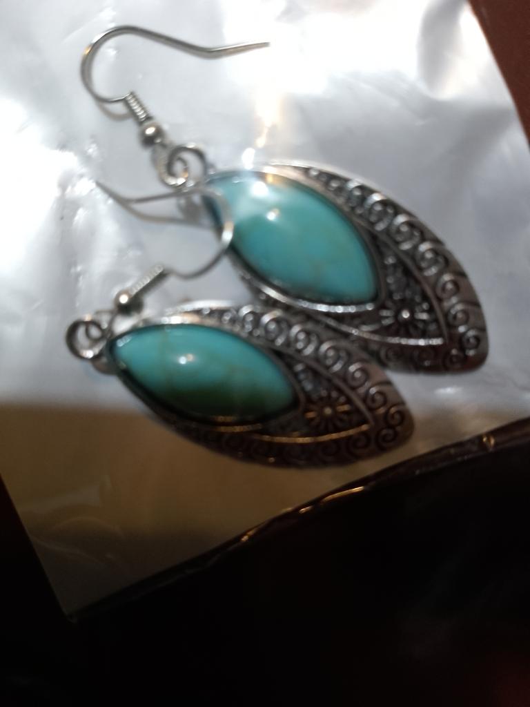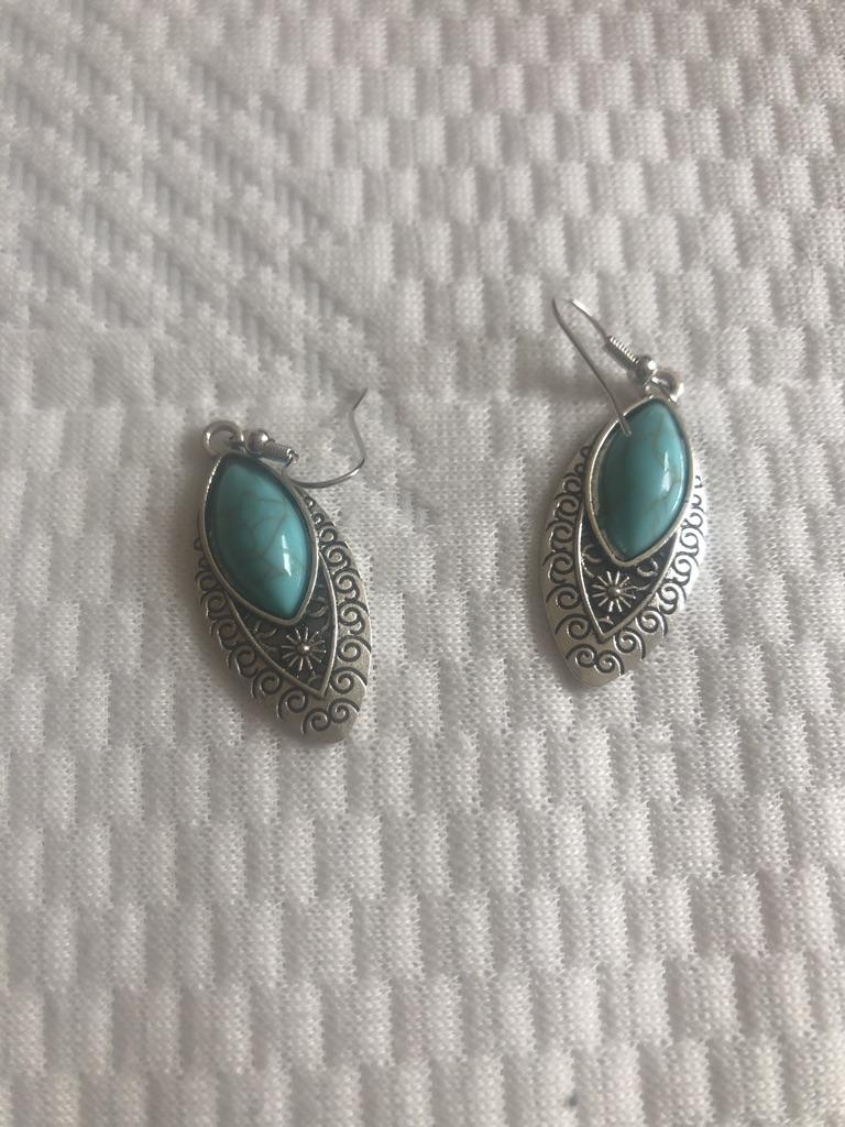Cercei cu cârlig în formă de picătură, cu incrustație boemă, turcoaz, ajurat, sculptat