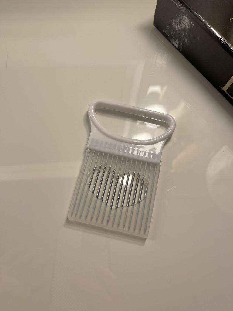 Ustensila de taiere, nu mai folosisem pana acum, iar adevarul este ca este foarte comod de folosit, are o aderenta buna si imi este mai usor sa fac bucati mai subtiri fara sa ma tai, foarte practic in viata de zi cu zi si chiar mai mult asa ca daca iti place sa gatesti zilnic. Sunt foarte multumit de produs. Calitatea este buna iar produsul corespunde informatiilor vanzatorului.