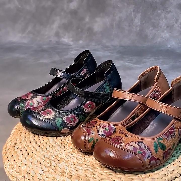 Johnature Pantofi de damă cu imprimeu în stil etnic, din piele naturală, cu vârf rotund, cu toc gros, cu talpă moale