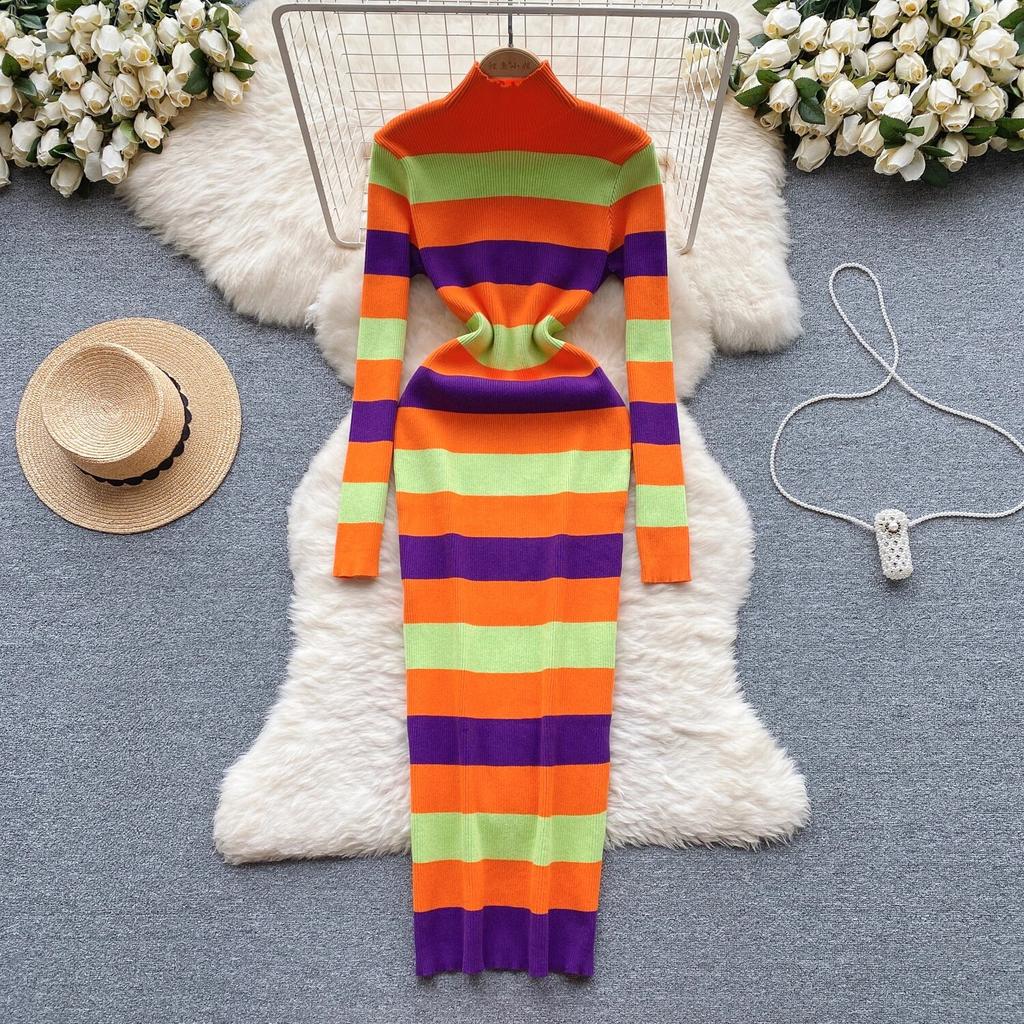 Rochie șic cu dungi pe jumătate guler înalt, tricot elastic, bodycon, cu mânecă lungă, pentru femei, la modă sexy, rochie de primăvară, subțire, rochie creion
