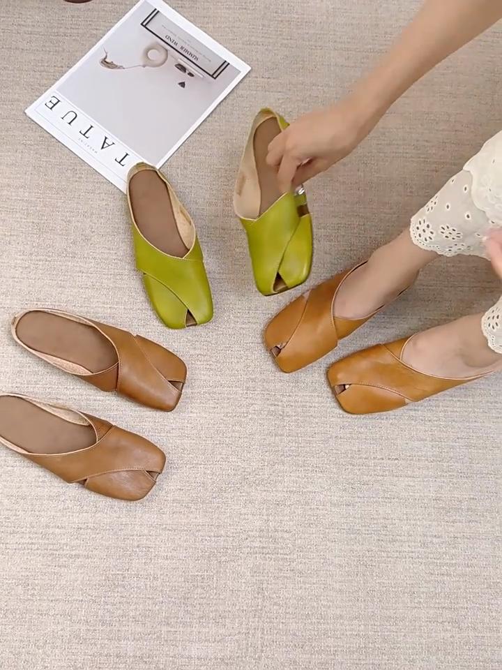 Johnature Papuci cu degetul pătrat din piele naturală Pantofi pentru femei Pantofi casual pentru exterior Pantofi confort papuci