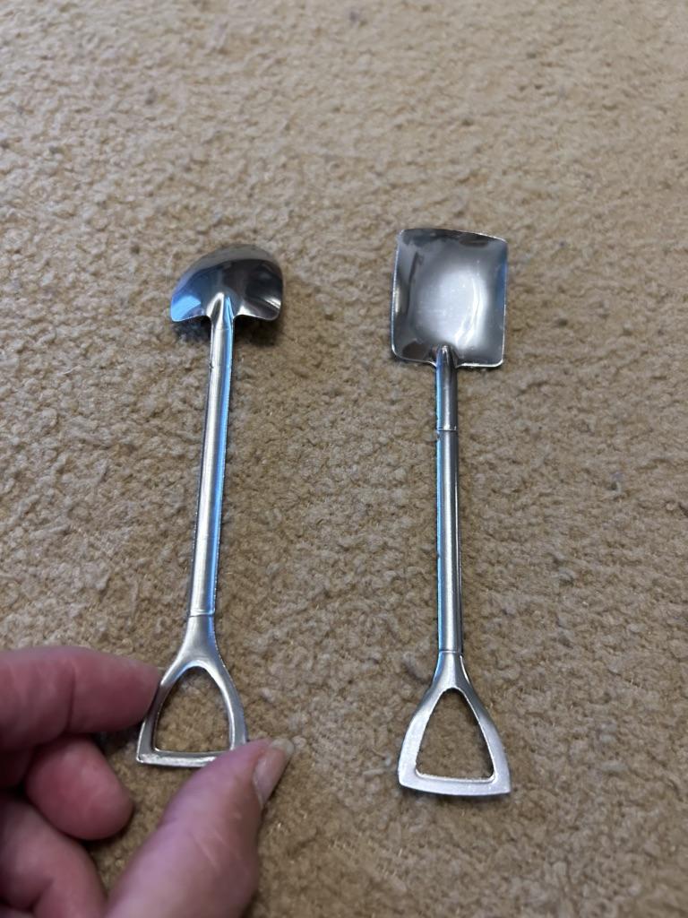 Set două lingurițe în formă de lopată. Destinat fructelor, dar le puteți pune și într-un vas de zahăr și le puteți folosi pentru decorarea grădinii. Fabricat din oțel inoxidabil. Dimensiune 3,5 pe 15,5 cm. La început mi s-a părut că sunt ascuțite pe margini, dar cred că așa este nevoie pentru a scoate pulpa din fructe. Ei bine, prețul este simbolic la achiziționarea din trei produse.