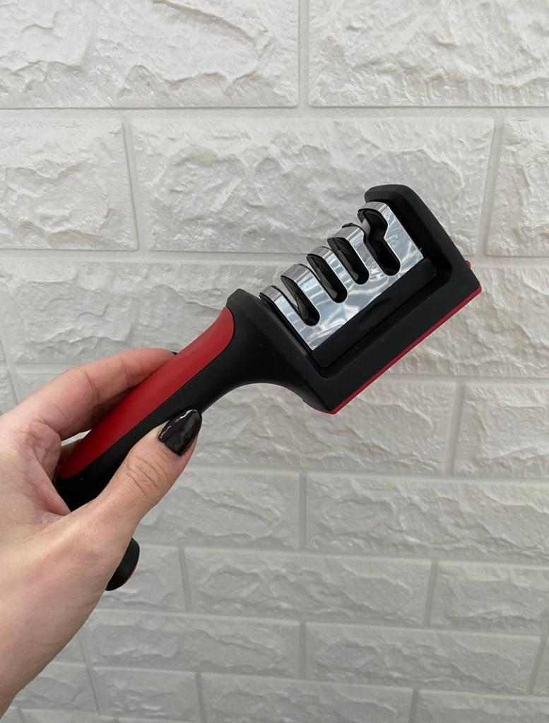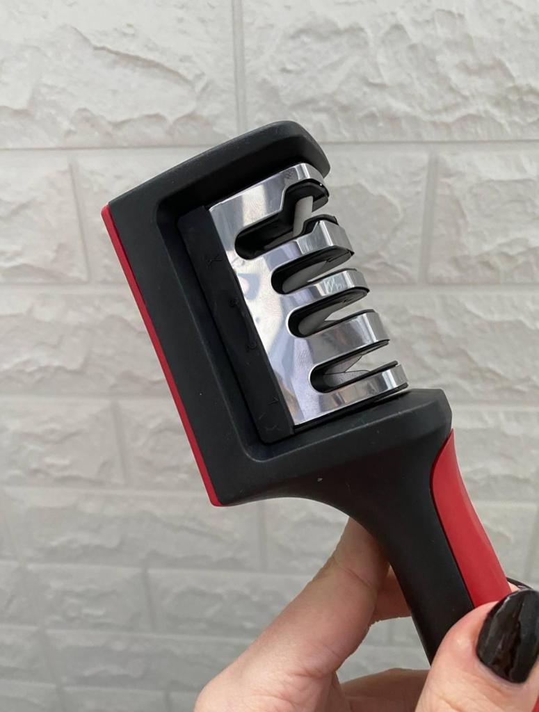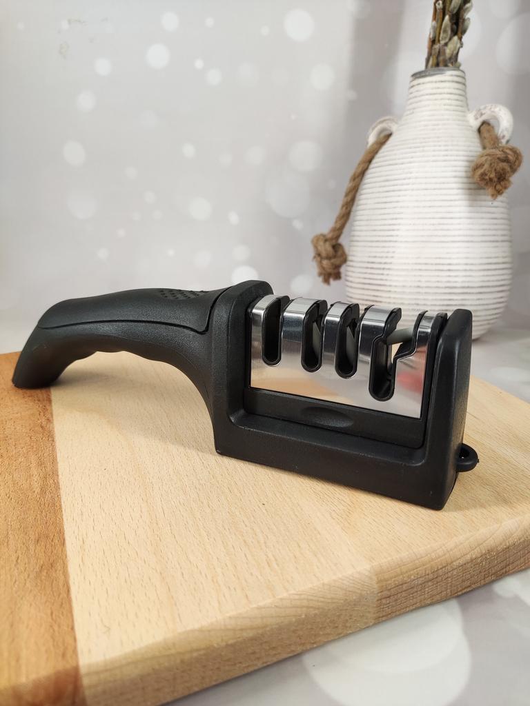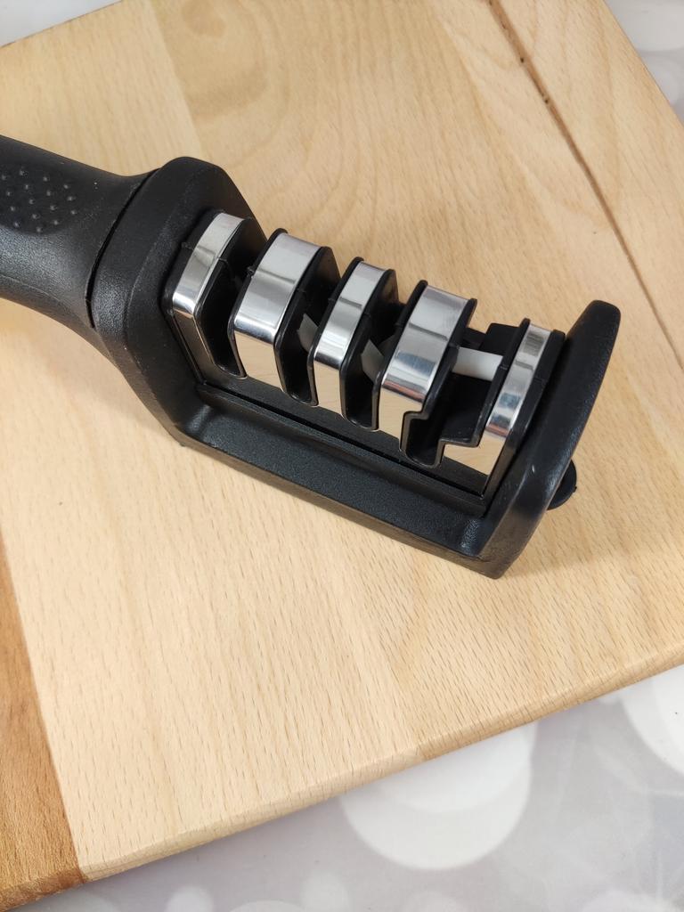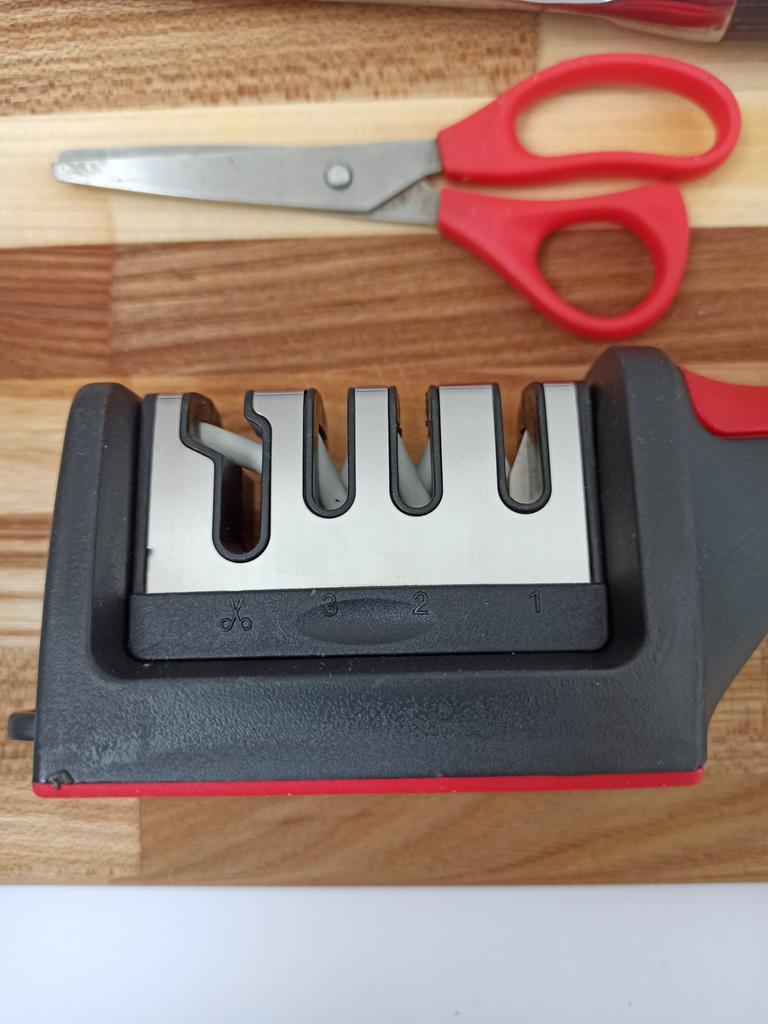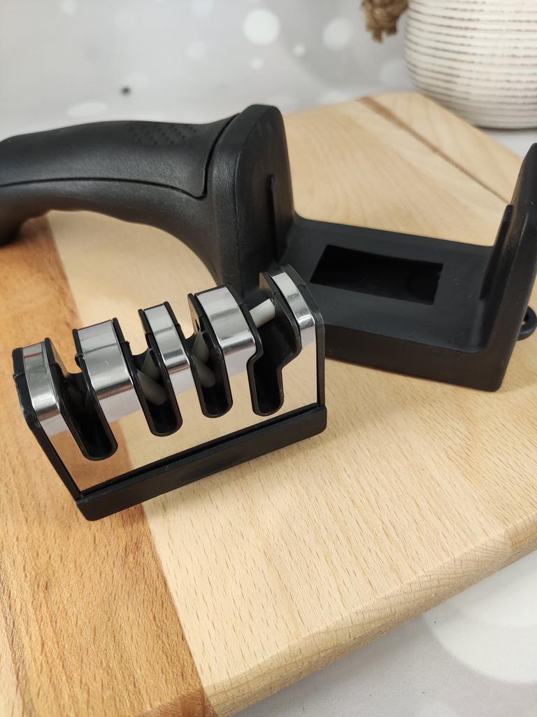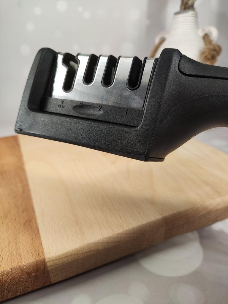 Evaluez excelent ascuțitorul pentru cuțite și foarfece! Chiar își face treaba bine și repede. Patru caneluri interschimbabile permit ascuțirea convenabilă chiar și a celor mai complexe unelte. Mânerul ergonomic cu orificiu pentru agățat este un plus excelent, făcându-l ușor și convenabil de depozitat. Ascuțitorul este din plastic, are fundul din acoperire anti-alunecare, este posibil să se instaleze caneluri din diferite părți. Pentru un astfel de preț, cu siguranță merită fiecare grivnă! De aceea am oferit întregii mele aceste ascuțitoare minune 😉