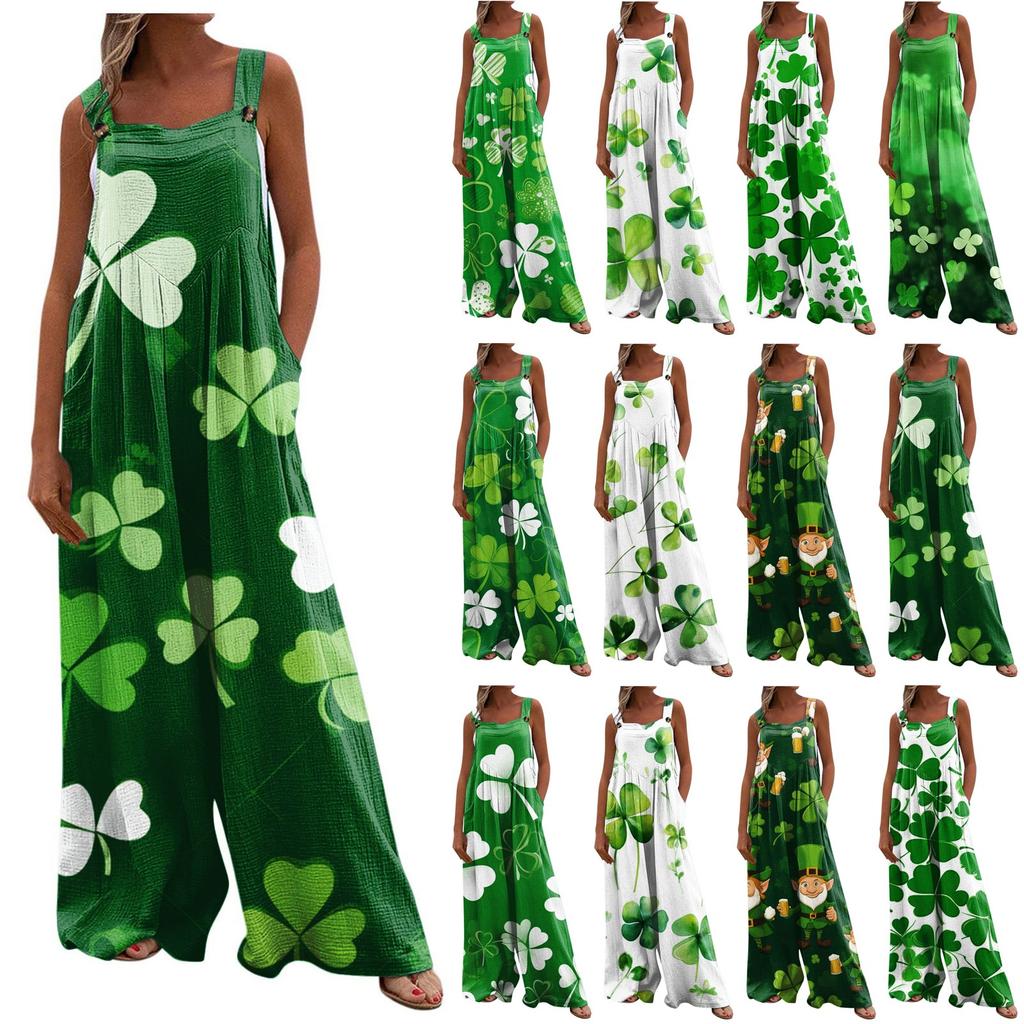 Salopete cu picioare late pentru femei Salopete lejer fără mâneci St. Salopetă cu pantaloni lungi, cu nasturi, cu buzunare, de ziua lui Patrick