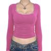 Tricouri scurte cu garnitură din dantelă pentru femei Cămăși cu mânecă lungă cu decolteu în U Primăvară toamnă Topuri slim fit Îmbrăcăminte de stradă