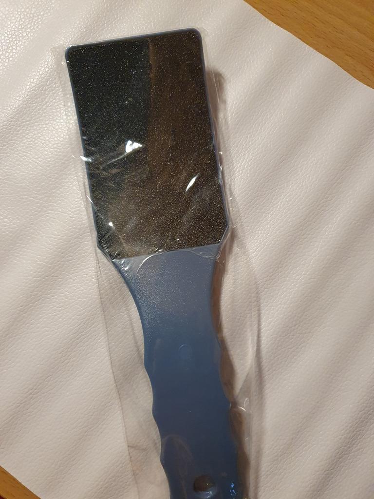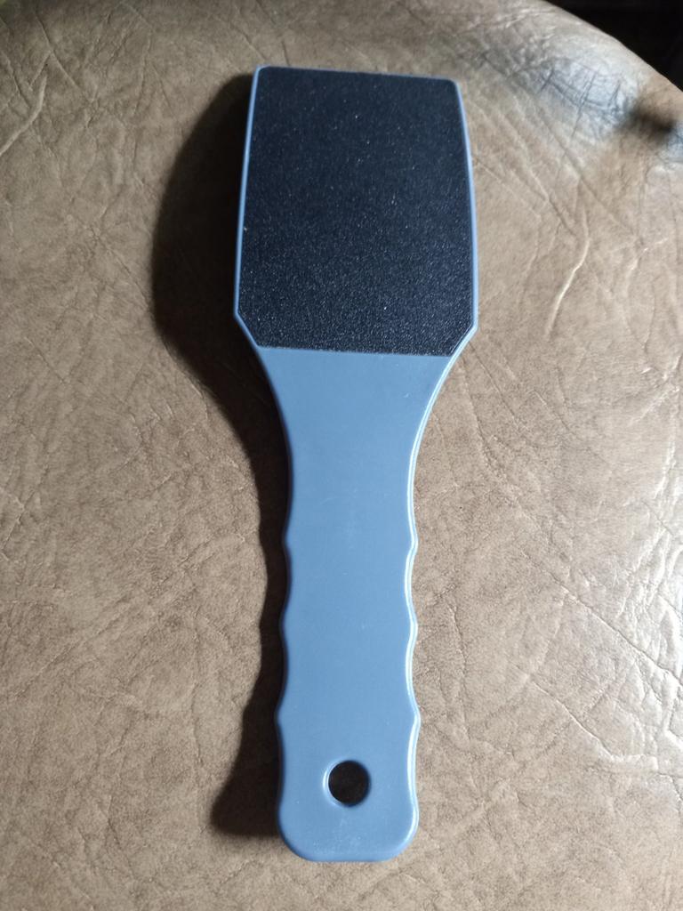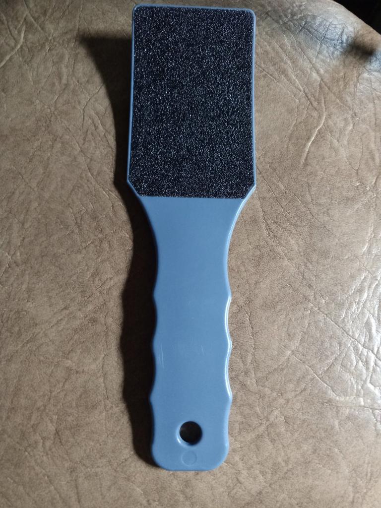 Pilă grozavă pentru călcâie. Față-verso. Pe o parte abraziv grosier, pe cealaltă fin, pentru lustruit. Mâner confortabil.