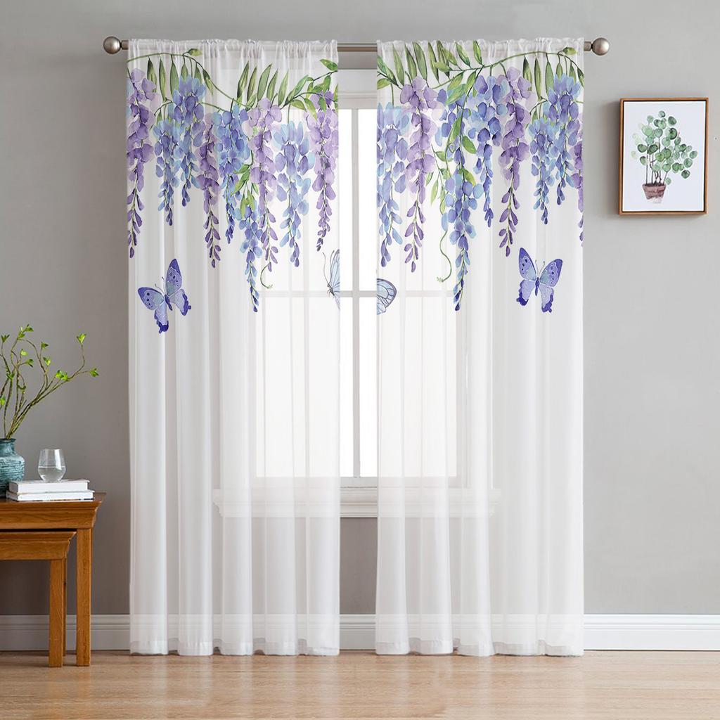Flori de primăvară, acuarelă, glicine, perdea de fereastră transparentă, perdele din tul pentru sufragerie, dormitor, hotel, decorațiuni interioare, draperii din voal