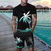 Set de vară pentru bărbați cu imprimeu grafic cu palmier de cocos tropical, cu mânecă scurtă și pantaloni scurți. Set de vară pentru bărbați cu tricou cu gât rotund și pantaloni scurți cu șnur