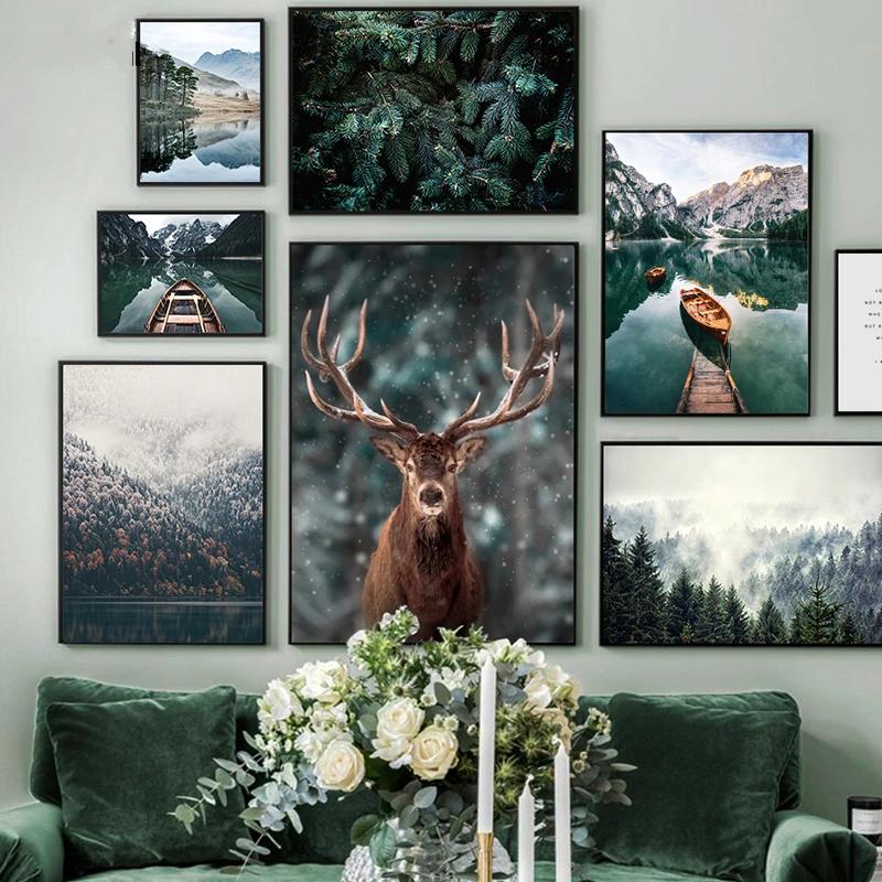 Snowing Landscape Forest Deer Nordic Poster, Animal Poster, Lake Boat, Christmas Leaves, Snow Mountain Prints, Nature Picture De