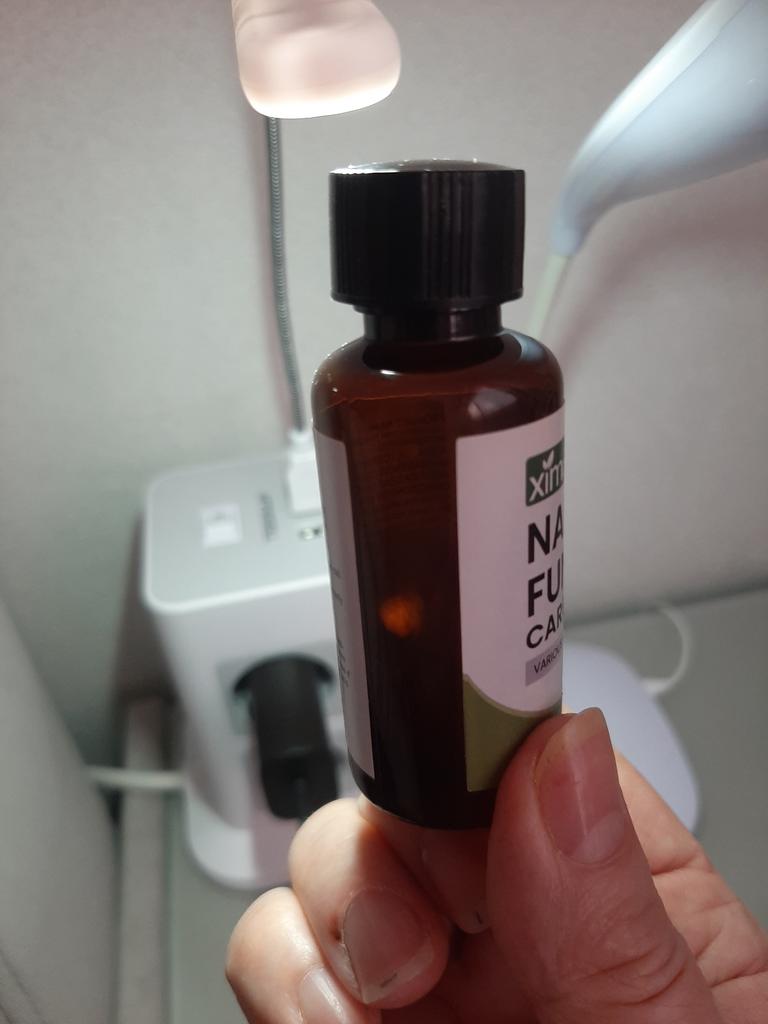 Cutia este sigilată în folie. În interior se află o sticluță din plastic închis la culoare, o pensulă și o pilă mică. Mirosul mi-a amintit de camfor. Despre rezultate este prea devreme să vorbim