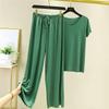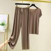 Pijamale de vară de damă cu decolteu în V Top cu mâneci scurte + pantaloni largi cu picioare largi Set din două piese de costum subțire simplu, de culoare uni