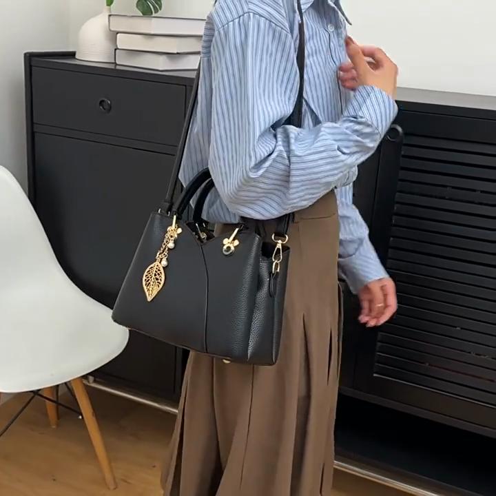Geantă clasică de culoare solidă, geantă de umăr elegantă texturată cu decor cu pandantiv din frunze