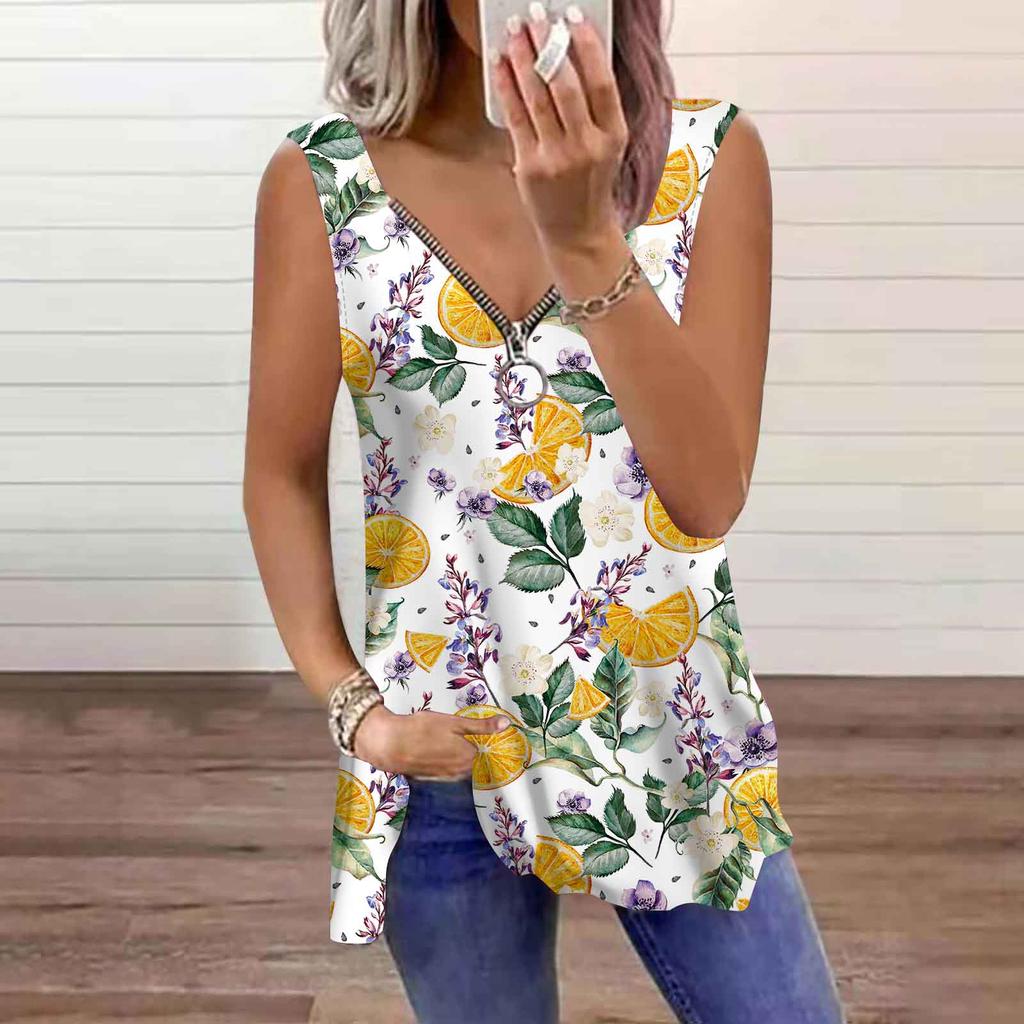 Women's Top Summer Lemon Printed Casual Plus Size Sleeveless Zipper V-neck Top Tank Top