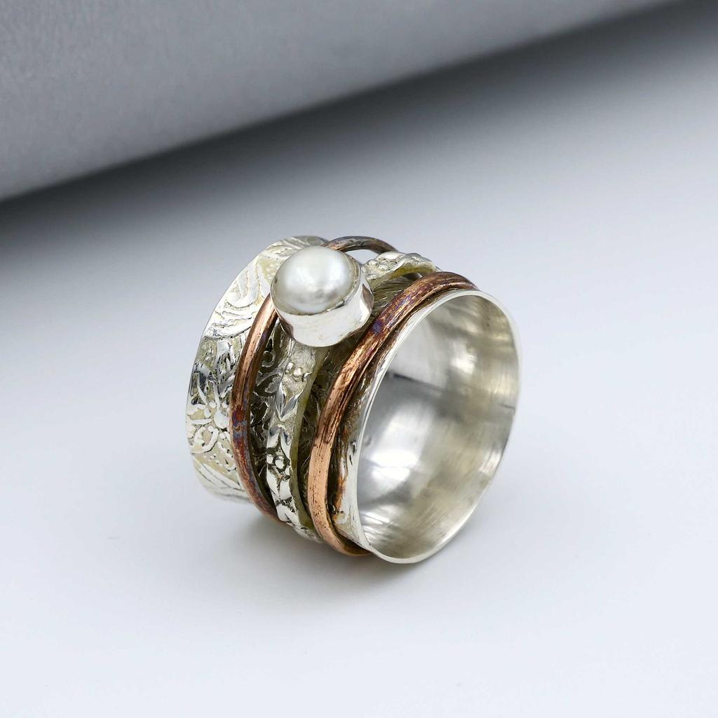 Inel din Argint Sterling 925, Inel cu Piatră Prețioasă Perlă Albă, Inel Bicolor, Inel Boem, Inel de Designer, Bijuterii din Argint