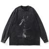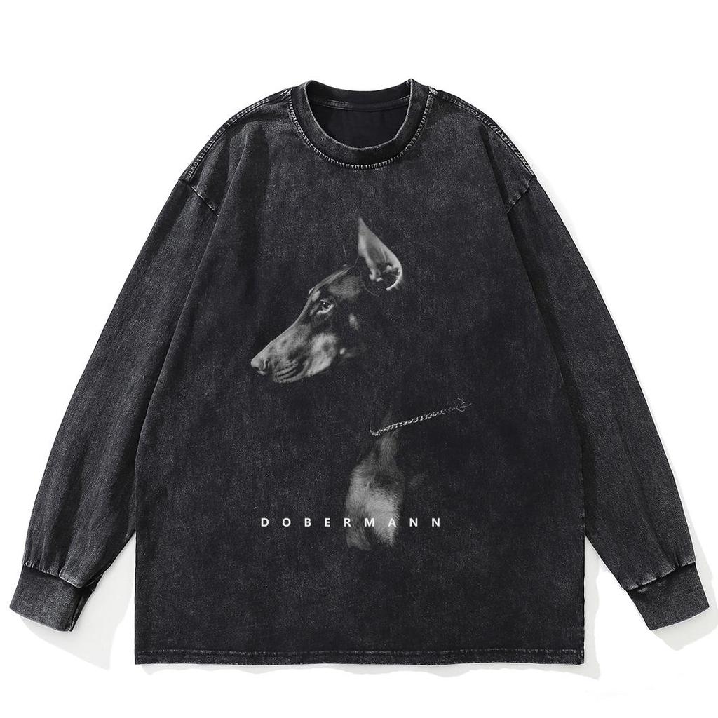 Tricou cu mâneci lungi, unisex, bumbac, negru spălat cu grafic Dobermann