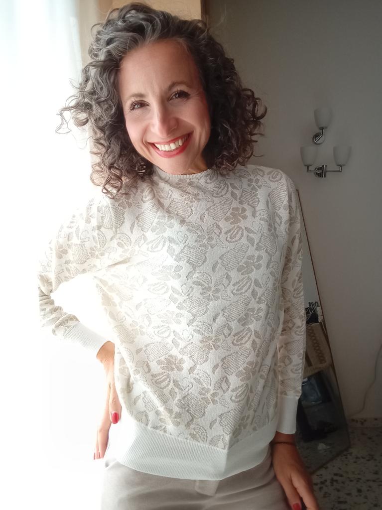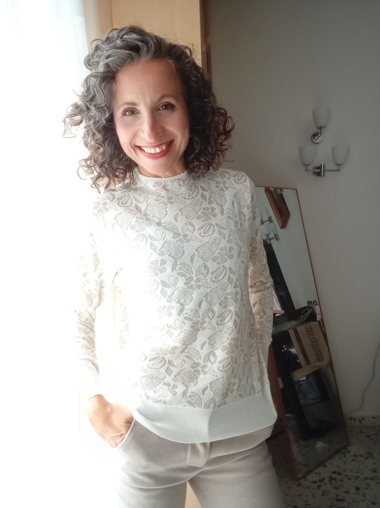 Pentru mărimea mea 46-48 este perfect. Se declară că bluza este gri, dar are floricele albastre, ceea ce mă satisface. L pentru mărimea 46.