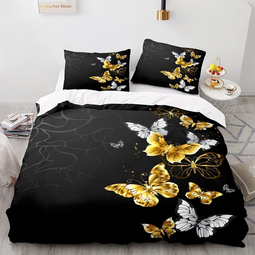Set cuvertură de pilota 2/3 buc. Set de lenjerie de pat cu fluture negru și auriu husă de pilota moale și confortabilă