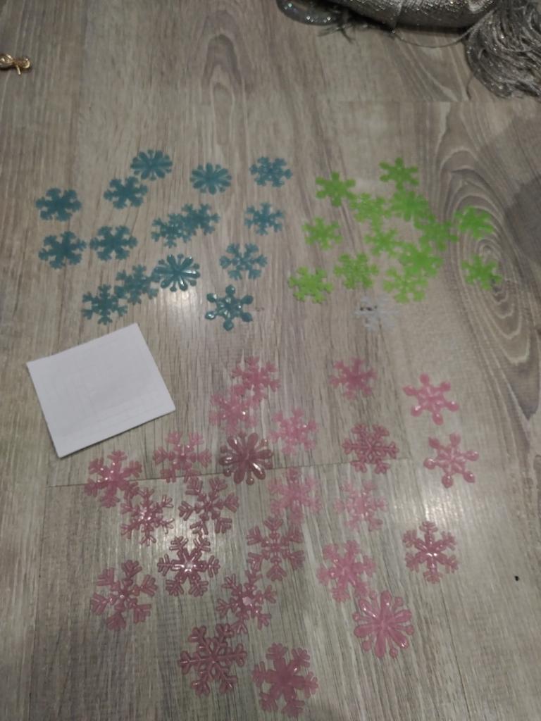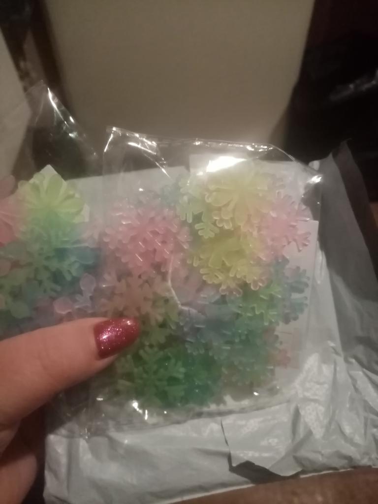 10 fulgi de zăpadă și pătrățele mici pentru lipit pe suprafață. Dacă luminează sau nu - încă nu am verificat. Trebuie să se încarce de la lumină. Mulțumesc.
