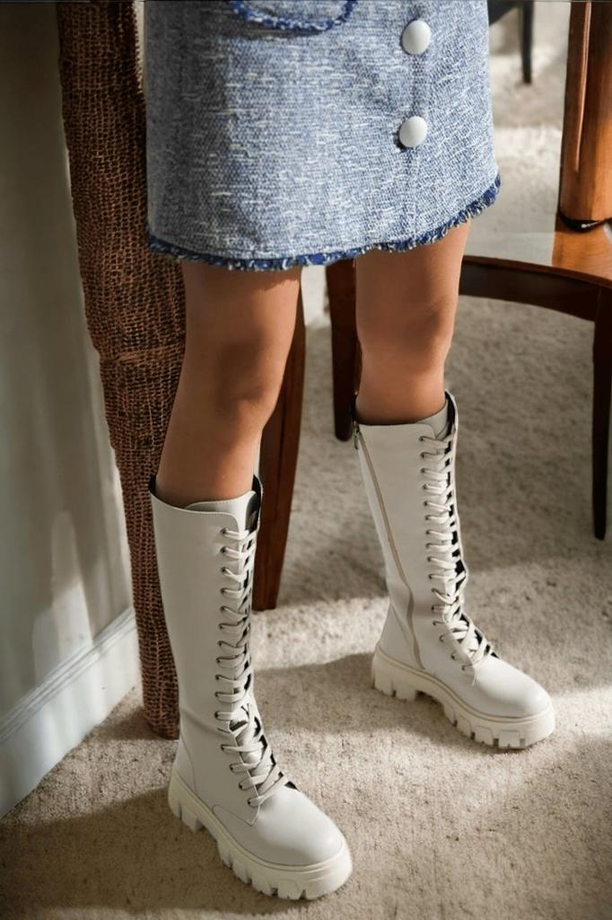 Women Modern Stylish Fashion Boots Boots Faux Leather Duksy Beige Lace-Up Side Zipper Casual Boots