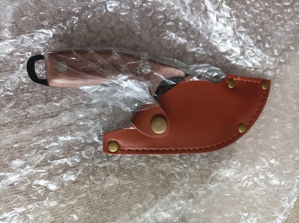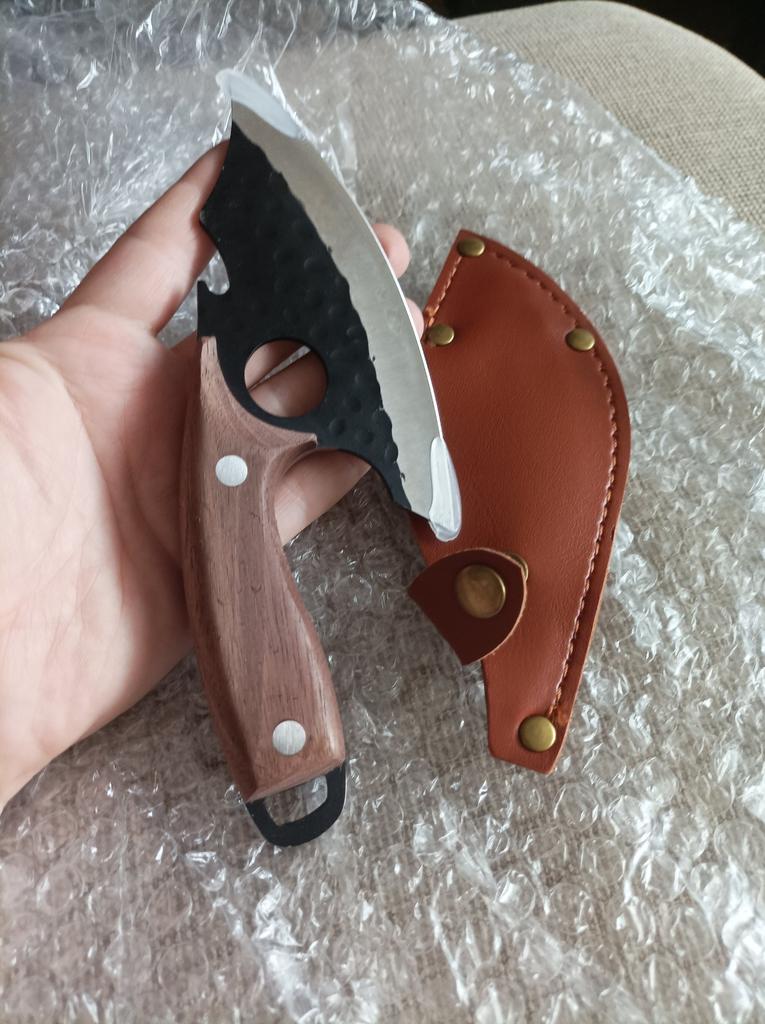 A sosit sănătos și sigur 🛍️🔪 Acest cuțit are un aspect rustic, artizanal, cu o lamă ciocanată care prezintă o tehnică tradițională de forjare. Mânerul din lemn arată ergonomic și robust, cu știfturi metalice pentru un plus de rezistență. Teaca din imitatie de piele inclusa este un plus frumos si asigura un transport sigur.. ✔ Claritate și performanță de tăiere Acest tip de lamă este conceput pentru tocare, feliere și lucrări de precizie. Forma sugerează că este ideală pentru mișcări mici de tocare, de exemplu la jupuirea vânatului sau la lucrările de tăiere fină în bucătărie. Marginea subțire de la vârf oferă probabil o margine ascuțită și precisă. ✔ Aderență și confort Mânerul din lemn arată bine modelat, cu o ușoară curbă pentru o prindere naturală. Degajarea pentru degete din lamă oferă un control suplimentar, care este util pentru lucrări de precizie. ✔ Întreținere și durabilitate Dacă aceasta este o lamă din oțel carbon, aceasta va fi foarte ascuțită și durabilă, dar predispusă la rugină. Ungerea regulată cu ulei și depozitarea uscată este importantă. Teaca din piele protejează lama, dar poate reține umezeala, așa că aveți grijă în medii umede. 🔪Concluzie🔪🥰 Acesta este un cuțit dur și funcțional, perfect pentru uz în aer liber, pentru activități de bushcraft sau bucătărie. Are un design autentic forjat manual și o formă practică.
