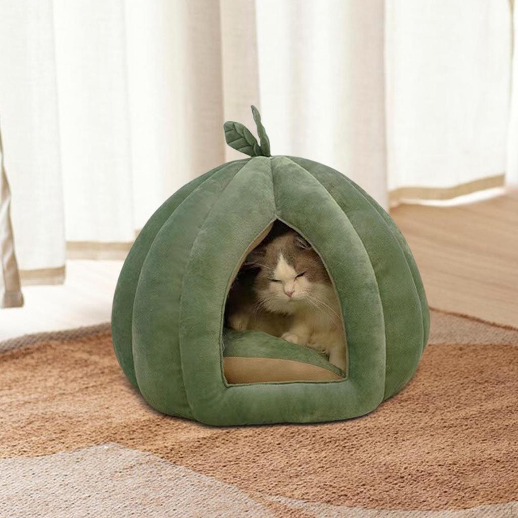 - 【Decorativ】: Peștera de pat pentru pisici este interesantă, forma sa de dovleac cu model de frunze poate stârni interesul animalelor de companie și poate fi, de asemenea, un peisaj frumos în casă.