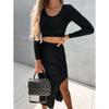 Set de damă, culoare uni, cu mâneci lungi, decolteu în U, top scurt, fustă lungă cu fante sexy, set din două piese